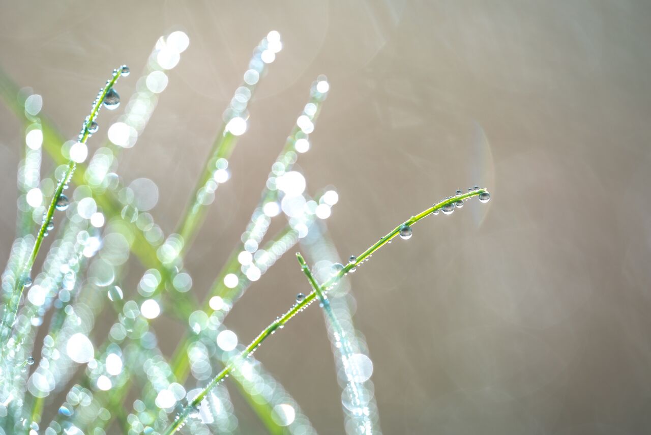 明け方の草木の先に露が結ばれ白くきらめく頃。